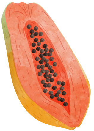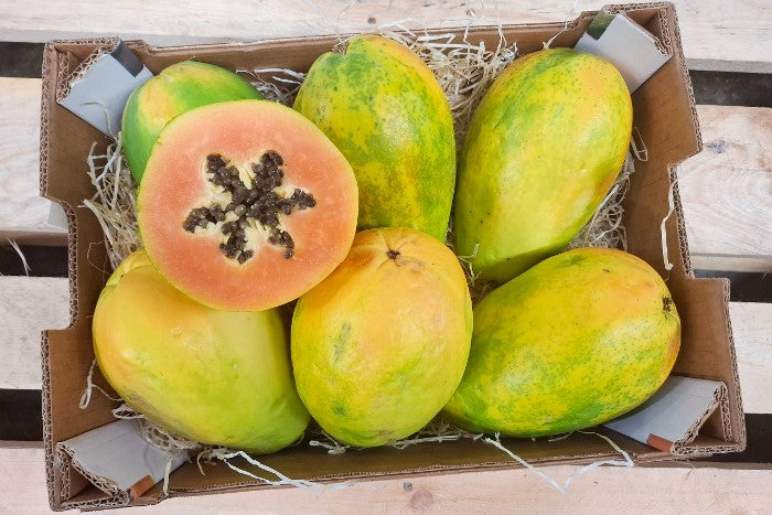 Das Fruchtfleisch ist saftig, butterweich und leicht süßlich, mit feinen Melonen- und Aprikosennoten. Reife Papayas schmecken mild, rund und tropisch-fruchtig – ideal zum Löffeln, Mixen oder als Zutat in herzhaften Gerichten.