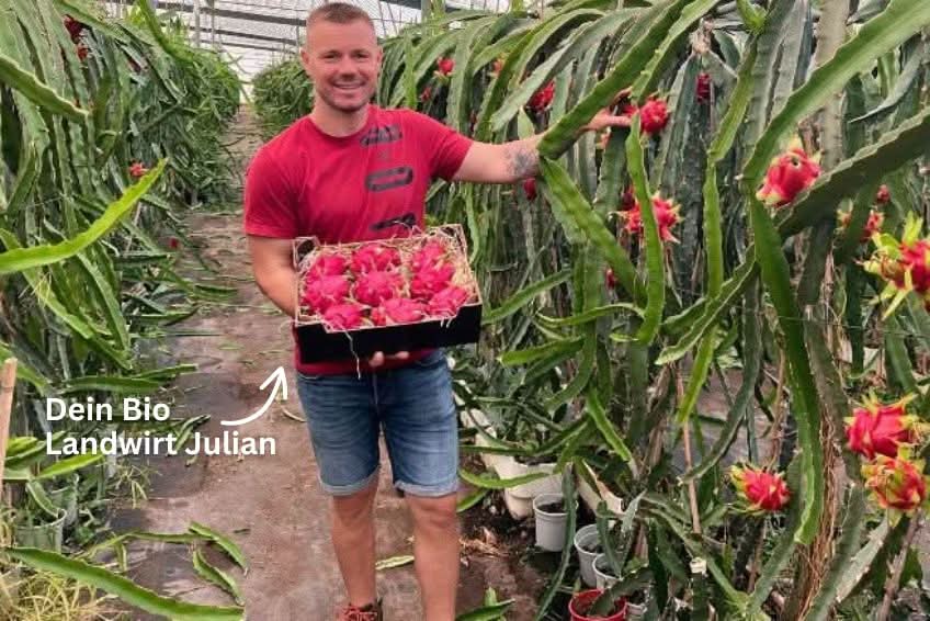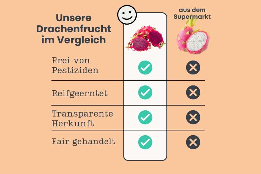 - Transparente Herkunft. Du weißt genau, wer Deine Drachenfrüchte anbaut – Wir legen Wert auf Transparenz und pflegen enge Beziehungen zu unseren Bauern.