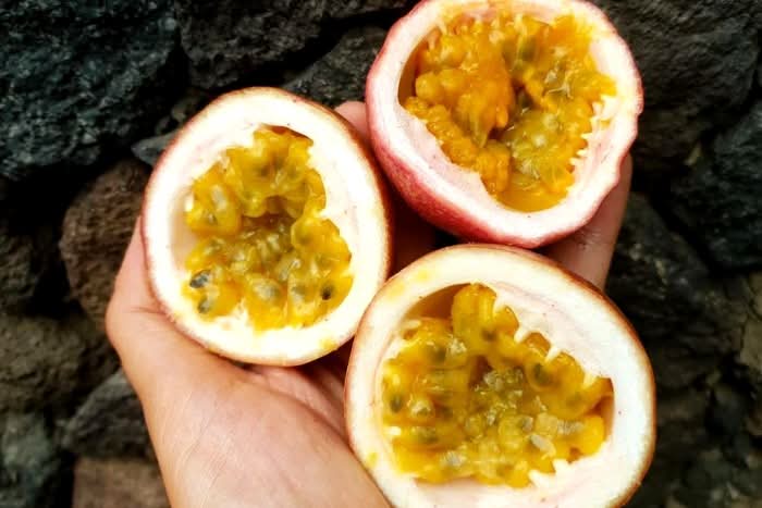Granadilla: Gold-orange & prall, braune Flecken sind normal.