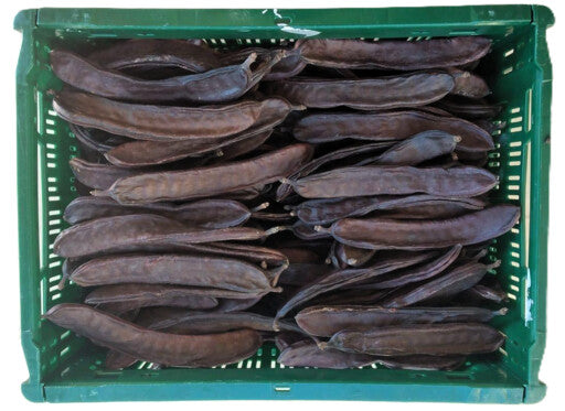 Das Fruchtfleisch wird getrocknet und gemahlen → Johannisbrotmehl oder Karobpulver.